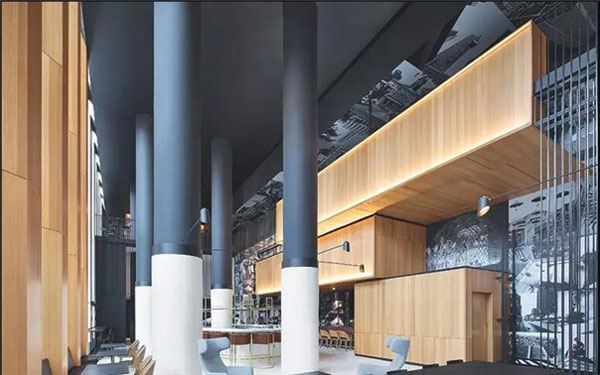 蒙維爾酒店,這是一家以工業(yè)風(fēng)為基調(diào)的酒店,黑白黃是酒店使用zui多的顏色,大堂的中央設(shè)有一個(gè)菱形的白色水磨石吧臺(tái),搭配以黃銅材質(zhì)的細(xì)部。經(jīng)典堅(jiān)硬與柔軟并存的創(chuàng)意指引了客人在此停留或休閑的和一杯咖啡,體會(huì)這舒適的感覺(jué)。