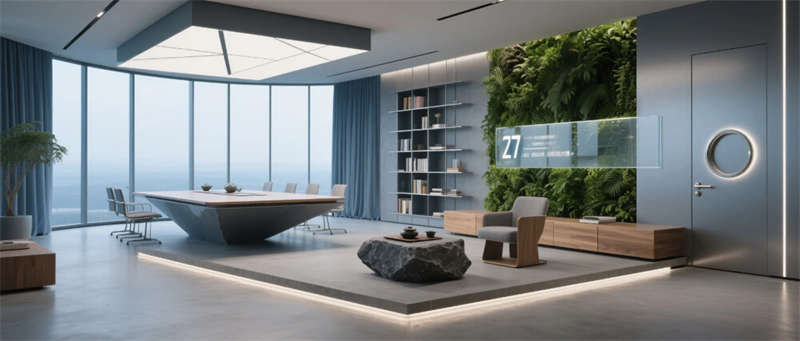 入口大廳以8米寬LED弧形屏呈現(xiàn)動態(tài)視覺沖擊,懸浮曲面黑巖板前臺與天花垂墜的3D打印樹脂裝置形成虛實對話;開放式辦公區(qū)通過模塊化磁吸工位與中央綠植柱,實現(xiàn)靈活協(xié)作與生態(tài)療愈的平衡;總裁辦公室270°全景落地窗搭配懸浮會議島,幾何切割天花與火山石茶臺演繹力量與自然的共生哲學(xué)。