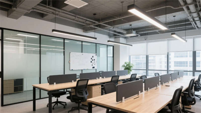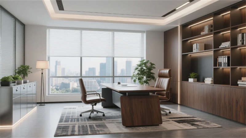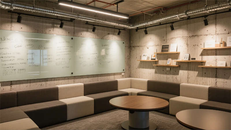 從前臺(tái)懸浮木紋臺(tái)面的企業(yè)標(biāo)識(shí),到開放式工位可變的模塊化組合,空間始終保持著“未完成”的進(jìn)化基因。頭腦風(fēng)暴區(qū)的可書寫玻璃墻記錄著思維軌跡,階梯培訓(xùn)區(qū)的滑軌電源系統(tǒng)隨需求生長,智能會(huì)議室霧化玻璃在透明與私密間自由切換,專注電話艙的磨砂質(zhì)感包裹著獨(dú)立思考的靜謐。高管辦公室的皮質(zhì)座椅與垂直線條燈帶,隱喻著決策的柔韌與果決,而咖啡區(qū)黑板墻的手繪痕跡,則讓機(jī)械齒輪般的空間有了呼吸的節(jié)奏。