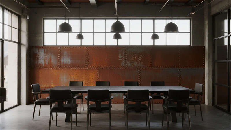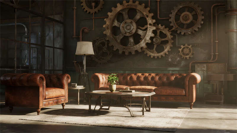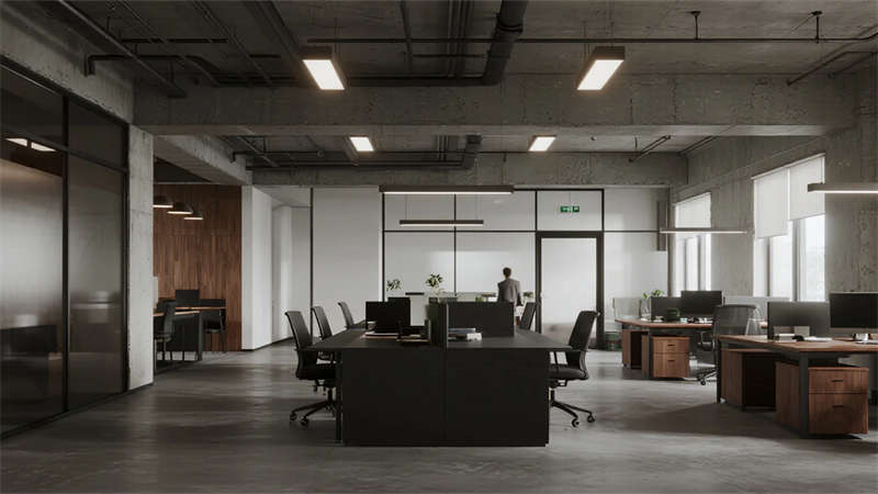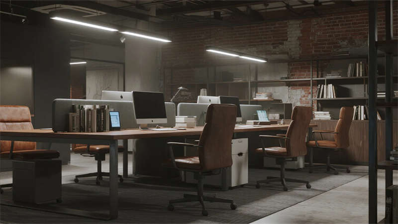 這組工業(yè)風(fēng)辦公室設(shè)計以裸露結(jié)構(gòu)和復(fù)古質(zhì)感為核心,通過混凝土、金屬和木質(zhì)材料的碰撞,打造出兼具實用性與藝術(shù)感的辦公空間??臻g保留了建筑的原始肌理,如天花板的管線和墻面的磚紋,搭配黑色鐵藝家具和深色調(diào)軟裝,營造出冷峻而富有張力的氛圍。局部通過皮質(zhì)沙發(fā)、綠植和暖光燈具軟化工業(yè)風(fēng)的硬朗感,增添人文氣息。