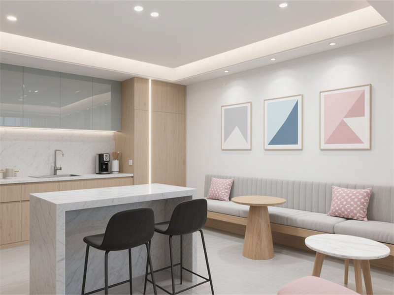 外觀設(shè)計(jì)上,采用淺灰色墻面搭配超白玻璃幕墻,玻璃內(nèi)側(cè)的品牌標(biāo)識(shí)與門前綠植相呼應(yīng),弱化了建筑的冷硬感,展現(xiàn)出簡(jiǎn)約大氣的辦公形象。進(jìn)入室內(nèi),前臺(tái)接待區(qū)以淺灰與米白為基礎(chǔ)色調(diào),L型前臺(tái)搭配柔和燈光,等候區(qū)的布藝沙發(fā)與原木元素結(jié)合,給訪客帶來(lái)溫和專業(yè)的第一印象。?