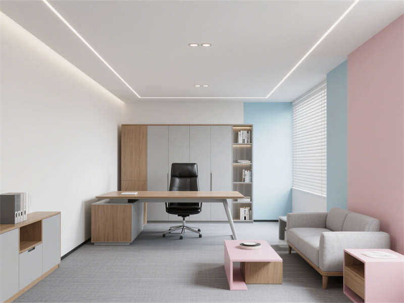 開放辦公區(qū)注重通透感與實(shí)用性,合理的工位布局兼顧隱私與交流,原木紋桌面增添溫馨感,點(diǎn)綴的莫蘭迪色系線條讓空間更顯靈動(dòng)。經(jīng)理辦公室融合辦公與接待功能,皮質(zhì)辦公椅與木質(zhì)家具提升質(zhì)感,靠窗的休閑角落為辦公之余提供放松空間。?