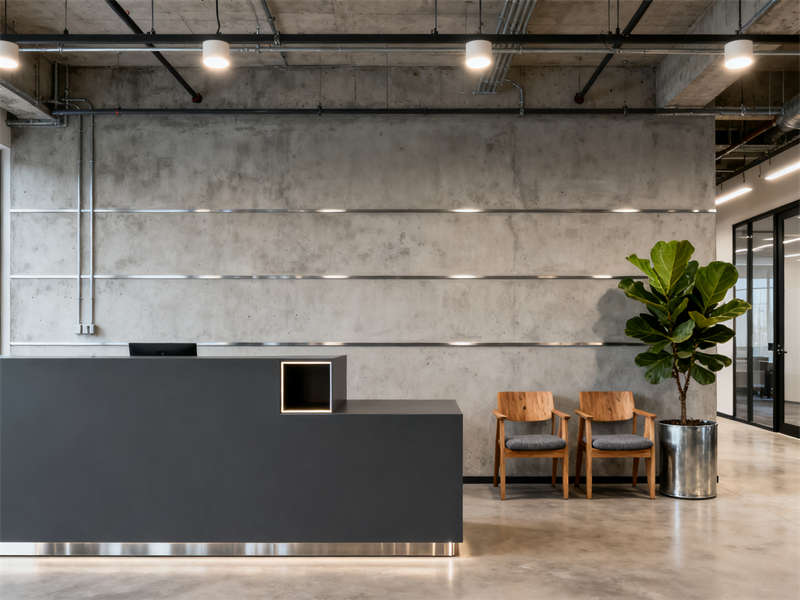 室內(nèi)空間延續(xù)整體風格,以深灰、淺灰與原木色為主色,搭配金屬元素點綴,材質上運用水泥漆、裸露管線(簡化處理)、實木與玻璃,構建出連貫的視覺體驗。前臺接待區(qū)用深灰色前臺與水泥漆背景墻奠定基調,等候區(qū)的原木色座椅緩解工業(yè)風的冷硬;開放辦公區(qū)以規(guī)整的桌椅布局保障高效辦公,共享工作臺與綠植隔斷提升空間活力。?