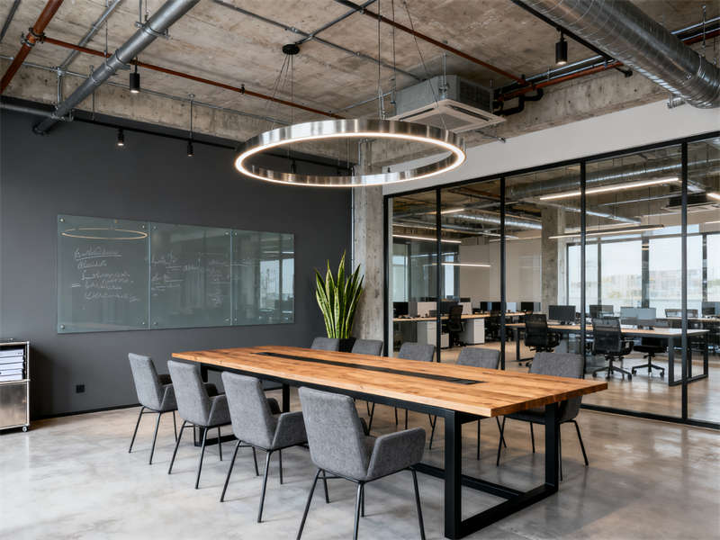 獨立辦公區(qū)域各有側重,總經(jīng)理辦公室通過辦公區(qū)與會客區(qū)的分區(qū)設計,營造層次感與商務氛圍;會議室的玻璃書寫墻與環(huán)形吊燈兼顧實用與設計感;財務室的檔案柜與地毯細節(jié),強化收納與靜謐屬性;茶水間以溫馨的操作臺與休閑區(qū),提供放松空間;技術研發(fā)辦公室則結合實驗操作臺與多接口工位,滿足專業(yè)辦公需求。整體設計在統(tǒng)一風格下,針對不同功能區(qū)域精準規(guī)劃,適配工廠辦公室的多元辦公場景。