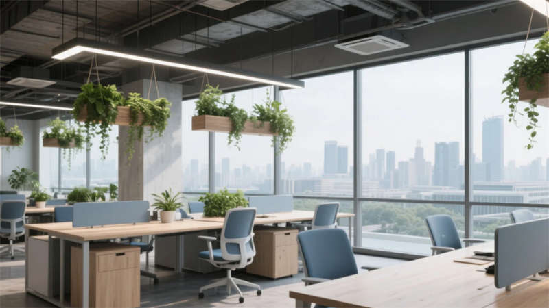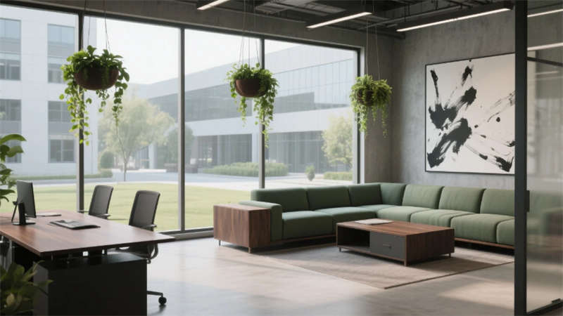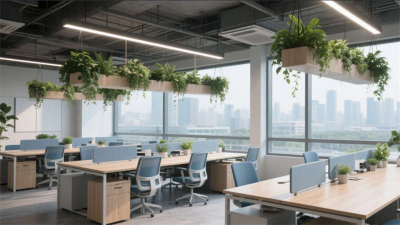 該辦公空間以"自然共生"為核心理念,將科技感與人文溫度融入兩千平米的開放場域。流動的淺木色調貫穿始終,啞光金屬與微水泥形成質感對話,模塊化家具構建靈活場景。綠植生態(tài)系統(tǒng)從空中吊籃蔓延至苔蘚墻面,模糊室內外界限。