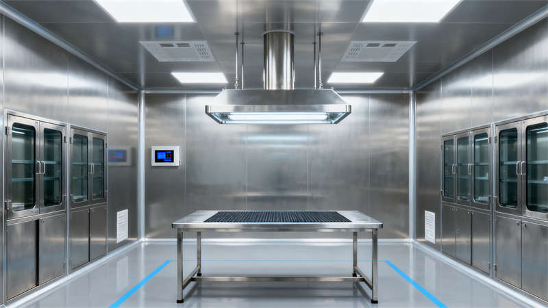 室內空間圍繞醫(yī)療器械生產需求展開,各區(qū)域設計既適配功能,又保持視覺統一。無菌組裝區(qū)域選用無縫潔凈材質,避免積塵殘留,保障生產環(huán)境;精密檢測區(qū)側重隔音與光線控制,為檢測工作營造低干擾氛圍;原料倉儲區(qū)以規(guī)整的貨架布局,適配物料存放需求;研發(fā)實驗室設置島式實驗臺與通風柜,兼顧實驗操作與中試功能;潔凈走廊通過指引設計明確人流物流方向,確保流程有序;無菌更衣區(qū)按潔凈流程分區(qū),實現人員潔凈過渡;中控室以核心監(jiān)控設備為中心,方便實時掌握廠房運行狀態(tài)。