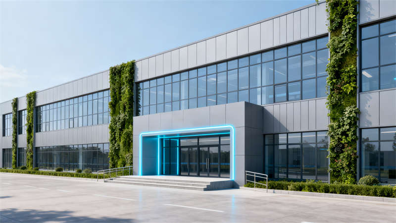 外觀設計上,融合玻璃幕墻與淺灰色金屬保溫板,讓建筑兼具通透感與保溫性能,同時輔以垂直綠化點綴外立面,平衡工業(yè)材質的生硬,入口區(qū)域注重實用與美觀的結合,方便設備運輸的同時,也提升了廠房的整體形象。
