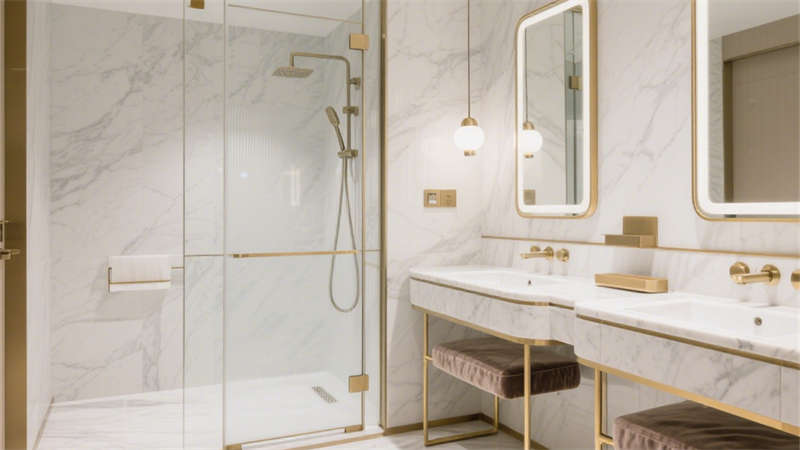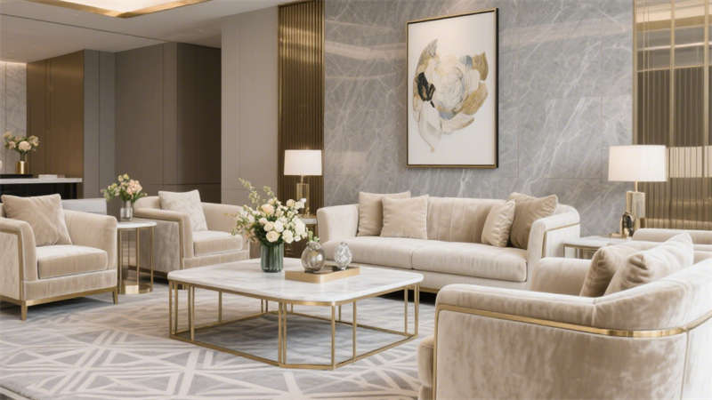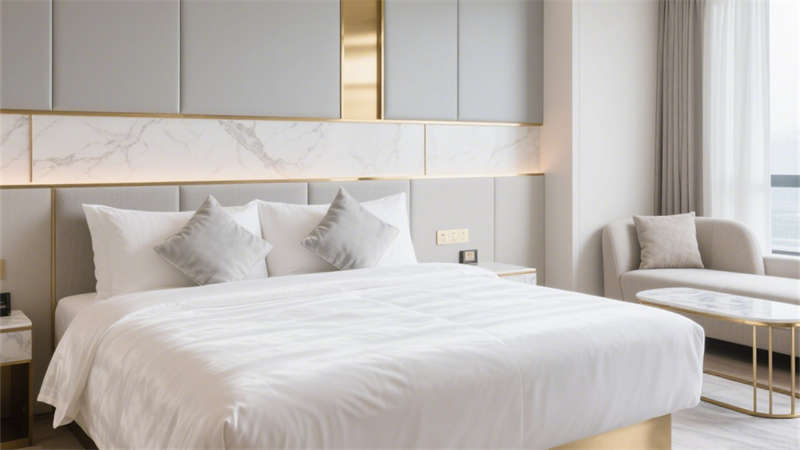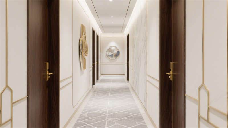 本設(shè)計以輕奢風(fēng)格為核心,通過柔和的基底色調(diào)與精致的細節(jié)搭配,構(gòu)建出兼具質(zhì)感與舒適度的酒店環(huán)境??臻g以米白色與淺灰色為基礎(chǔ),巧妙融入金色金屬線條作為點綴,既避免了過度奢華的厚重感,又增添了空間的精致度。墻面與地面選用細膩的大理石紋理材質(zhì),在光線映襯下呈現(xiàn)出自然的光澤,提升整體空間的高級感。家具選型注重線條的簡約流暢,搭配柔軟的布藝軟裝,營造出溫馨舒適的居住氛圍。各個區(qū)域在設(shè)計上保持風(fēng)格統(tǒng)一,從公共空間到客房區(qū)域,都延續(xù)了輕奢的設(shè)計語言,讓整體空間既富有格調(diào),又能給人帶來放松愜意的居住體驗。