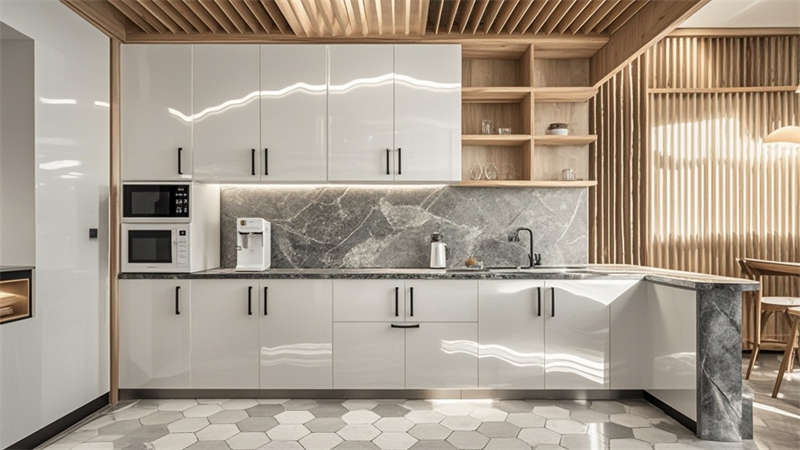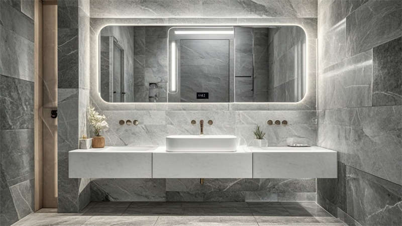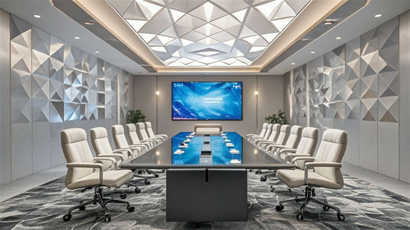 辦公區(qū)采用模塊化布局,配置智能升降桌和人體工學椅,裸頂噴灰工藝結合軌道燈系統(tǒng)實現(xiàn)靈活照明。色彩體系以高級灰為基底,搭配原木色系緩解視覺壓力,局部采用深藍跳色增強空間層次。材質(zhì)運用注重環(huán)保性能,墻面大量使用穿孔吸音鋁板,地面采用防滑地膠與靜音地毯組合。