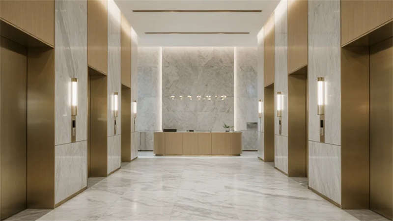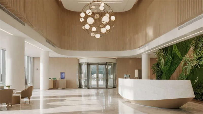 本設(shè)計(jì)以現(xiàn)代簡(jiǎn)約美學(xué)重構(gòu)辦公空間本質(zhì),建筑外觀采用純凈的玻璃幕墻與幾何切割形體,在晝夜交替中演繹光與影的韻律。入口大廳通過(guò)挑高空間與弧形前臺(tái)營(yíng)造開(kāi)放包容的儀式感,綠植墻與球形燈具的點(diǎn)綴賦予空間自然生機(jī)。電梯間延續(xù)極簡(jiǎn)語(yǔ)言,香檳金金屬與巖板材質(zhì)碰撞出低調(diào)質(zhì)感。