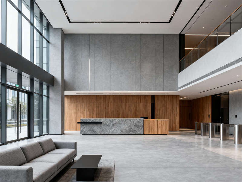入口大堂以開闊格局為核心,淺灰地磚搭配低飽和木色前臺,弱化厚重感的同時,用金屬線條勾勒細(xì)節(jié),讓第一印象既專業(yè)又通透。玻璃隔斷貫穿多個區(qū)域,在走廊處搭配木色門牌,既保證采光,又通過材質(zhì)呼應(yīng)強化整體感,避免空間割裂。
