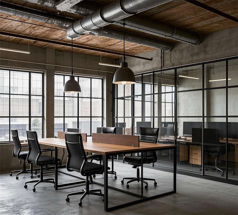 前臺(tái)接待區(qū)以深色木質(zhì)桌和皮質(zhì)沙發(fā)為主,搭配暖色調(diào)燈光和綠植點(diǎn)綴,既保留了工業(yè)風(fēng)的硬朗,又增添了溫馨感。開放式辦公區(qū)采用金屬支架桌和玻璃隔斷,既保證了空間的通透性,又提升了工作效率。會(huì)議室和經(jīng)理辦公室則通過深色木質(zhì)家具和落地窗設(shè)計(jì),凸顯出高端與穩(wěn)重。休息區(qū)和茶水間以舒適的皮質(zhì)沙發(fā)和金屬吧臺(tái)為亮點(diǎn),為員工提供了放松和交流的空間。創(chuàng)意討論區(qū)則通過不規(guī)則家具和白板墻激發(fā)靈感,而電話間則以玻璃隔斷和隔音設(shè)計(jì)保障了隱私需求。整體設(shè)計(jì)在保留工業(yè)風(fēng)原始質(zhì)感的同時(shí),注重功能性與舒適性的平衡,打造了一個(gè)既實(shí)用又充滿個(gè)性的辦公環(huán)境。