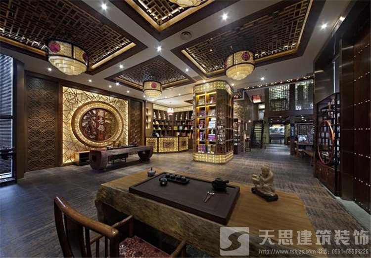 古典中式裝修茶樓會所大廳設(shè)計(jì)溫馨寬敞散發(fā)著獨(dú)特的茶文化,整齊有序紅木茶展柜色澤渾厚且秀麗透亮,嵌入式方格天花吊燈搭配現(xiàn)代感極強(qiáng)的紅木圈椅含蓄而內(nèi)在,泡一杯清茶,品味葉的裊娜,水的清澈,便有了清風(fēng)自來的心爽。