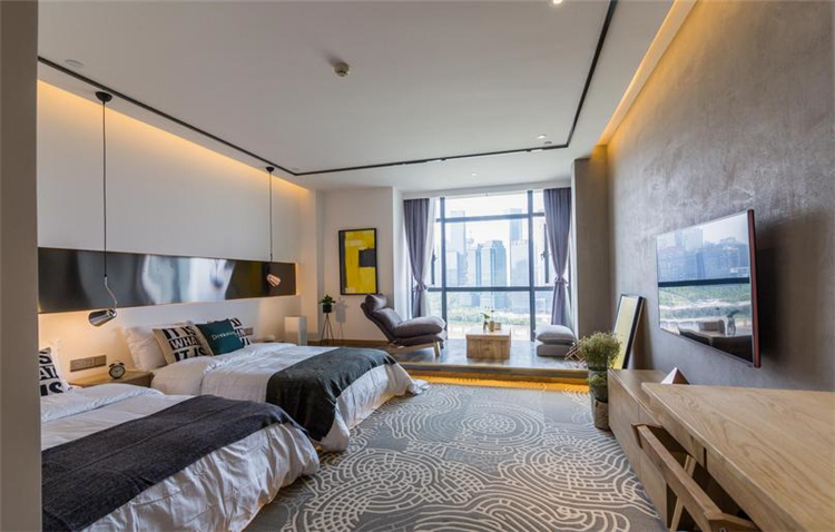 溫馨、小資、賓至如歸是本案設(shè)計(jì)的一條主線。大面積的墻體刷白,不做墻面大面積包裝,簡(jiǎn)簡(jiǎn)單單,讓空間更溫馨;配以部分水泥墻面做一個(gè)灰色系的穿插,讓空間在白的基礎(chǔ)上得以小范圍的格調(diào)提升,配上顏色稍微跳躍的畫及床品,視覺(jué)得以輕微的沖擊,不那么刺眼,更多的搭配原木木制品讓人更親近自然,讓客人感覺(jué)舒適,如歸家般放松。