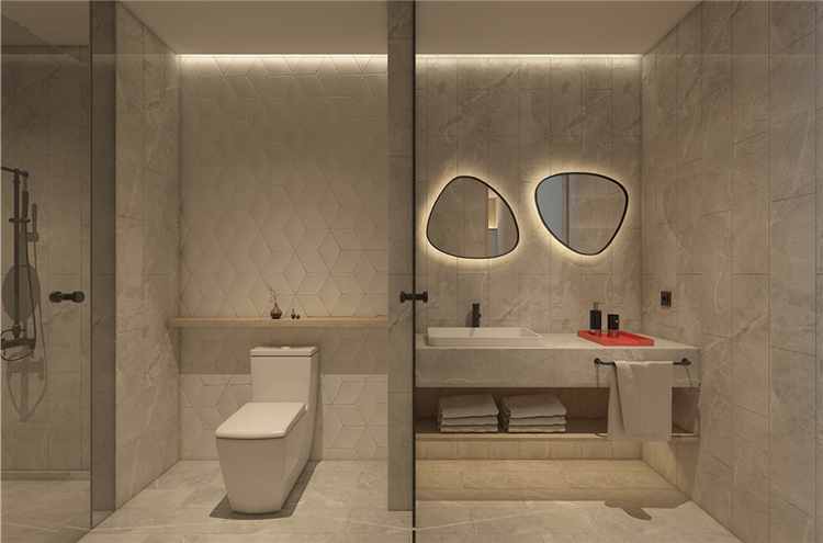 設(shè)計(jì)師遵循原有的管道設(shè)計(jì),通過(guò)半堵實(shí)用的功能墻,將洗浴間和馬桶間劃分,在隱形了五金件和儲(chǔ)物歸納后,化繁為簡(jiǎn)被得到了充分的運(yùn)用,就連回風(fēng)口也被巧妙的融入在燈帶里.