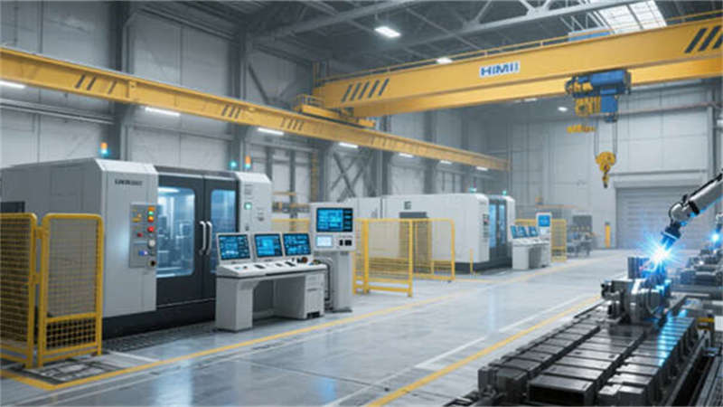 核心生產(chǎn)區(qū)以灰調(diào)環(huán)氧樹脂地坪為基底,大型CNC加工中心與智能機(jī)械臂組成“U”型產(chǎn)線,頂部集成黃色安全標(biāo)識(shí)的橋式起重機(jī)軌道,配合藍(lán)光焊接機(jī)器人動(dòng)態(tài)光軌,形成極具未來感的工業(yè)圖景。辦公區(qū)突破傳統(tǒng)廠房設(shè)計(jì),通過混凝土肌理墻面、懸浮式玻璃會(huì)議艙及企業(yè)色聲學(xué)模塊,構(gòu)建開放互聯(lián)的智慧管理中樞。