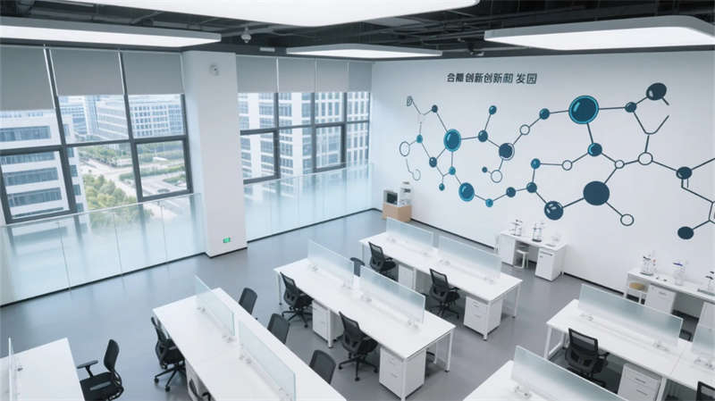 物流中庭的挑空設計打破廠房尺度壓迫感,懸掛式數據看板如抽象藝術品,與玻璃穹頂投下的天光共構科技禪意。研發(fā)區(qū)可移動實驗裝置墻體現柔性生產理念,分子結構藝術墻繪暗喻制造背后的科學探索。