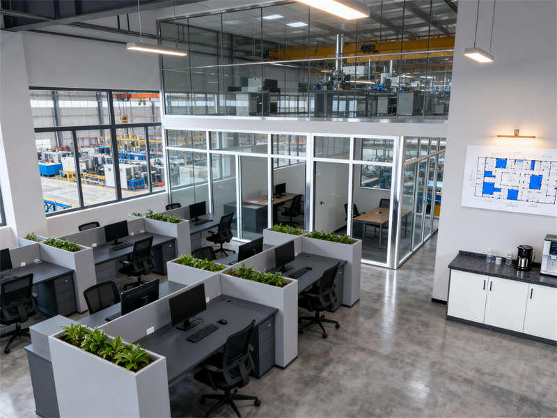 成品檢驗(yàn)區(qū)配備精密檢測(cè)儀器,合理的分區(qū)設(shè)計(jì)與適宜的照明,為精準(zhǔn)檢測(cè)提供保障。員工辦公區(qū)與休息區(qū)則兼顧實(shí)用性與舒適度,開(kāi)放式辦公布局搭配獨(dú)立辦公室,休息區(qū)的沙發(fā)、餐柜等設(shè)施,為員工營(yíng)造出良好的工作與放松環(huán)境。整體設(shè)計(jì)在色彩與材質(zhì)運(yùn)用上保持高度統(tǒng)一,既體現(xiàn)工業(yè)廠房的專業(yè)特質(zhì),又增添了人性化氛圍。?