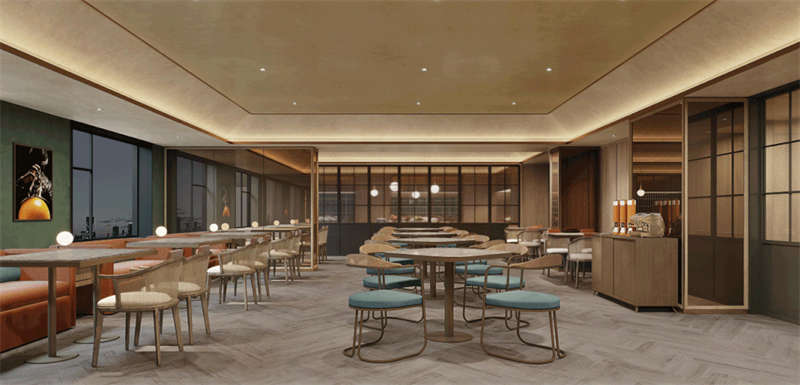 在歡快的爵士樂曲調(diào)中,捕捉到美式復(fù)古鄉(xiāng)村風(fēng)格,以空間意向?yàn)樵绮筒蛷d拉開生活的帷幕。延續(xù)橙綠色過渡與碰撞的軟裝飾基調(diào)。以熱帶植物為基調(diào)的藤桌椅,在溫和的木飾面與保平特種藝術(shù)漆相結(jié)合的空間背景下,營造出舒適的感官體驗(yàn)。墻上掛著爵士鄉(xiāng)村樂隊(duì)的照片,營造出一種藝術(shù)氛圍。在享受美食的同時(shí),也能在微妙的空間層次感中獲得不錯(cuò)的體驗(yàn)。