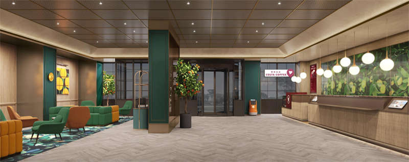 以橙綠色植物作為視覺引導(dǎo)的開端,在吸頂燈球形吊燈下定制了大面積的橙色圖案,拓展了空間主題。印花、地毯和橙綠色軟家具成為伴奏的色彩運(yùn)動(dòng)。它們?cè)诖筇门c客人的感官互動(dòng),營造出自然風(fēng)格和諧的現(xiàn)代城市畫卷。
