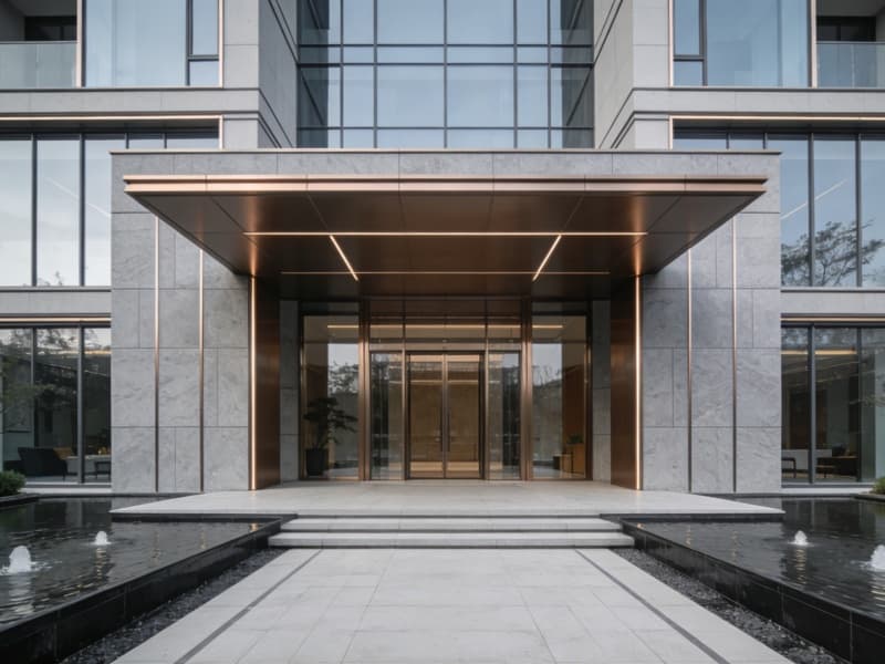 本設(shè)計秉持“簡約輕奢,旅居雅境”的理念,為4000平酒店打造高品質(zhì)空間。外觀采用淺灰色石材與通透玻璃搭配,輔以金屬線條勾勒,簡潔大氣又具時尚感。入口設(shè)挑高門廊,搭配旋轉(zhuǎn)門與迎賓水景,營造出尊崇的入戶體驗。