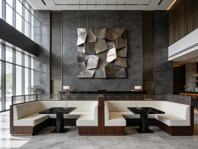 酒店一層為公共區(qū)域,大堂地面鋪淺灰色大理石,前臺背景墻以巖板結(jié)合藝術(shù)裝置,彰顯格調(diào)。大堂吧設(shè)半私密卡座,供客人休憩交流。全日制餐廳配備開放式廚房,可讓客人直觀感受美食制作過程。