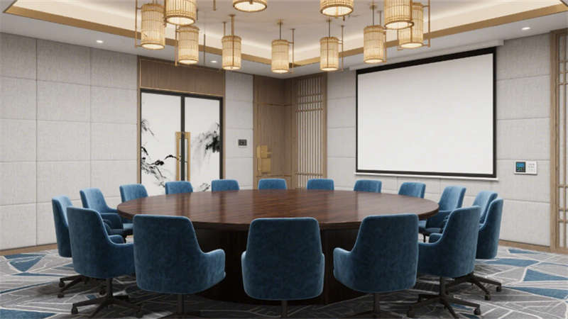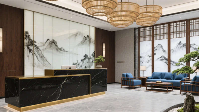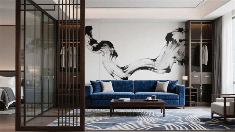 步入大堂,深胡桃木墻面與淺灰石材地面構成經(jīng)典東方底色,水墨藝術玻璃屏風似山巒疊嶂,懸浮竹編吊燈以編織肌理軟化空間。靛藍色沙發(fā)與黃銅細節(jié)的點綴,既延續(xù)外立面色彩邏輯,又激活視覺層次。餐飲空間延續(xù)木格柵語言,竹編燈罩與黑陶器皿在開放式廚房的金屬框架中碰撞,演繹“新舊共生”的餐飲儀式。