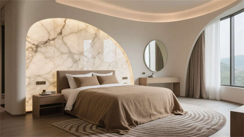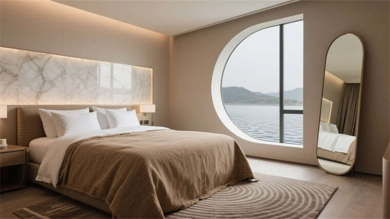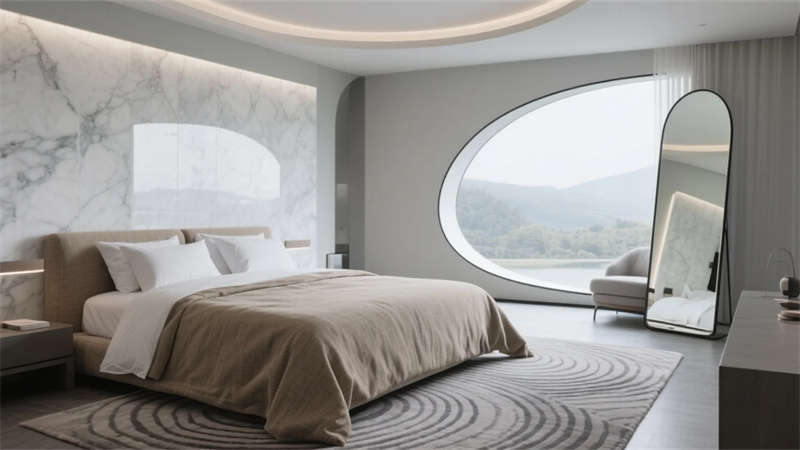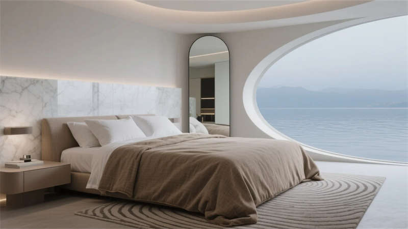 每一處細(xì)節(jié)皆成藝術(shù)現(xiàn)場——走廊夯土墻鐫刻時光肌理,發(fā)光地磚指引探索路徑;臥室弧形鏡面折射虛實,讓人沉入湖居夢境。這里不僅是棲居之所,更是一場喚醒感官的在地美學(xué)巡禮,讓合肥的湖韻林語,成為流淌于日常的奢享印記。