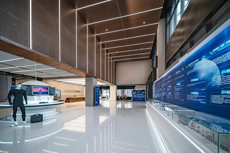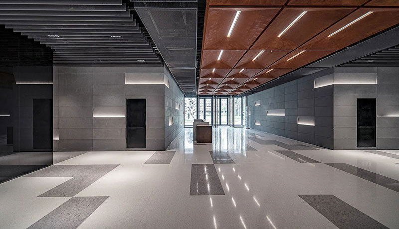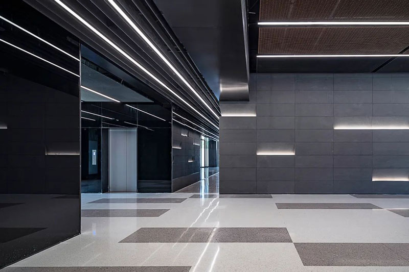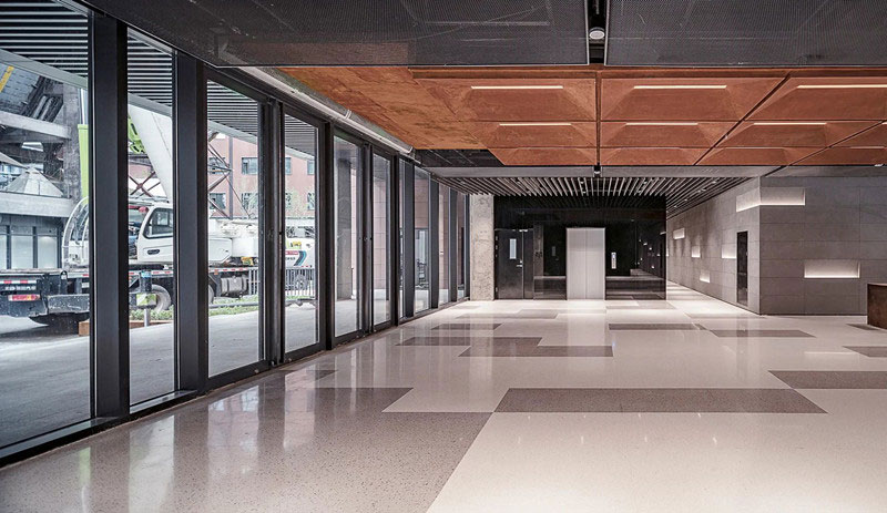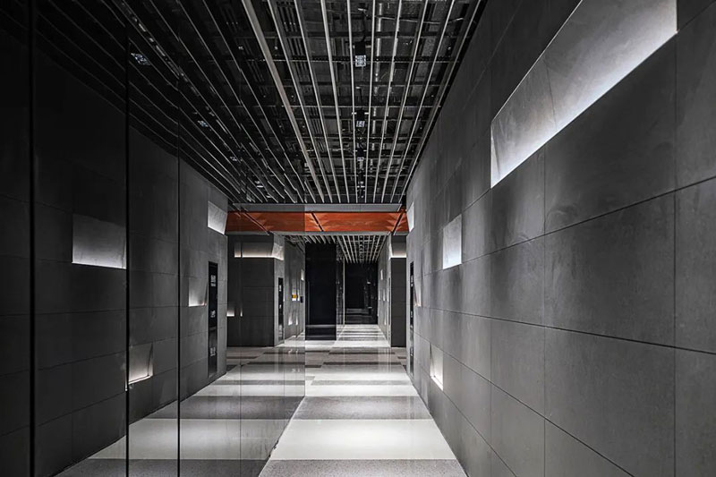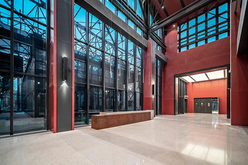 低飽和度紅色鋼板與黑色鋼板形成視覺(jué)碰撞,銹板前臺(tái)、懸浮燈飾與金屬結(jié)構(gòu)架讓空間闊達(dá)簡(jiǎn)練,通高的玻璃幕墻借景舊建筑的殘影,使之成為室內(nèi)裝飾的一部分。