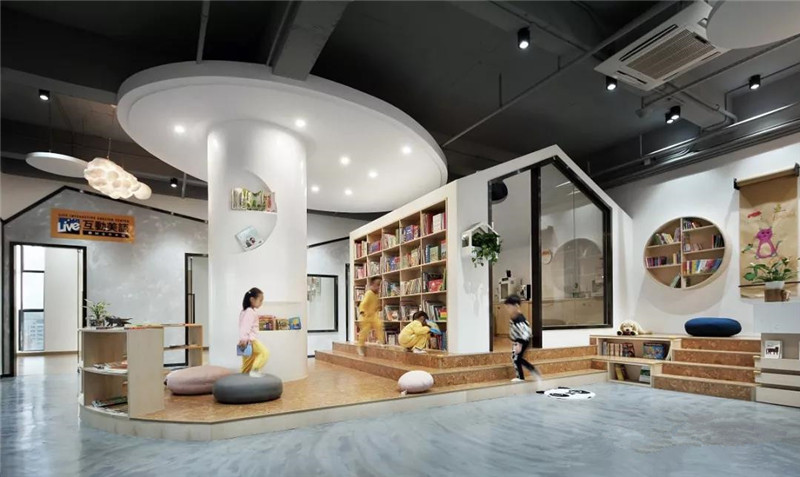 為了保持空間的調(diào)配度,不做過(guò)多裝飾;色彩把控上,選擇自然親和的白、灰、木色調(diào),孩子們是唯一的濃墨重彩,繪本則是星星點(diǎn)點(diǎn)的輔助色。用“書(shū)吧”的概念打造大廳,弧形書(shū)架、圓形吊頂與地面抬升的設(shè)計(jì),讓繪本閱讀成為體量?jī)?nèi)的重心。