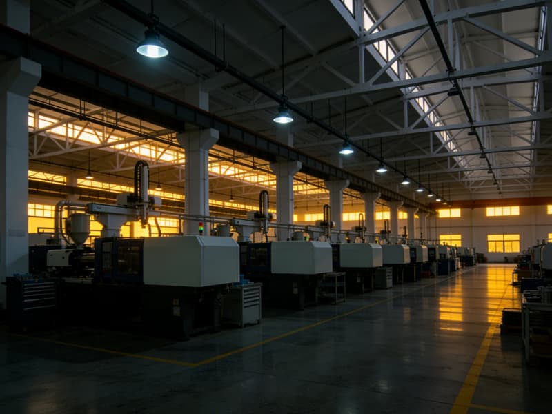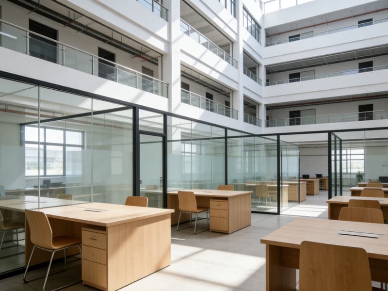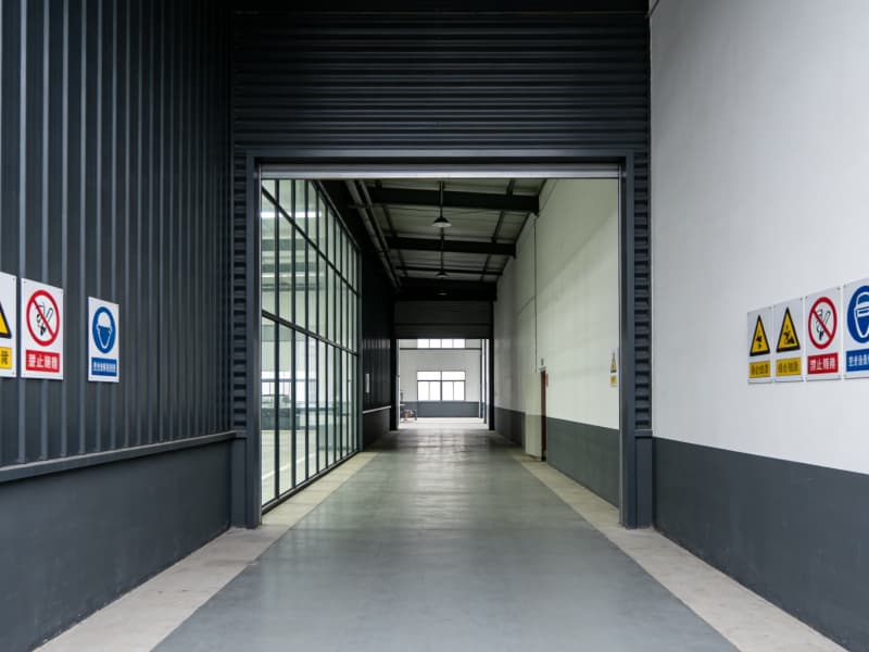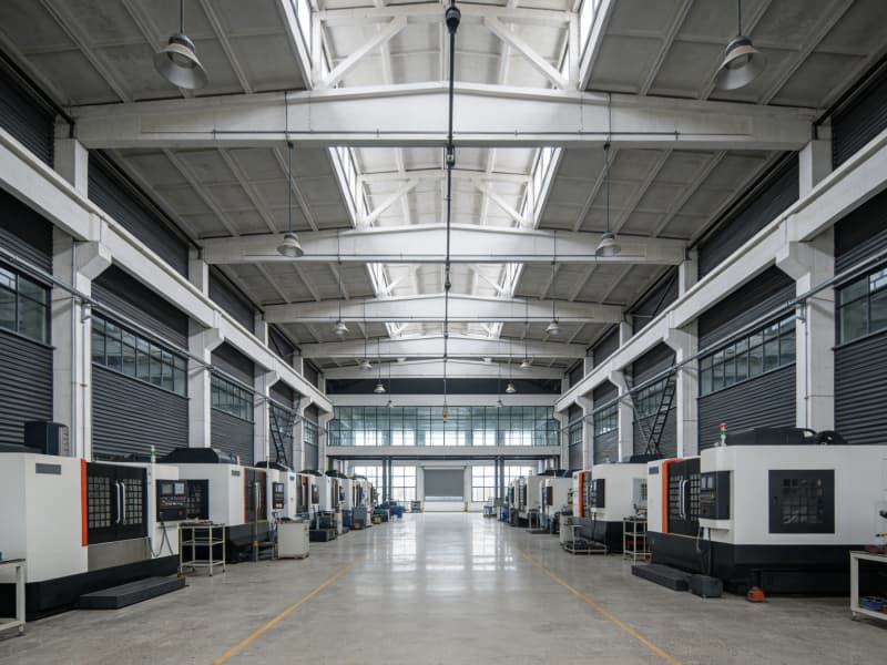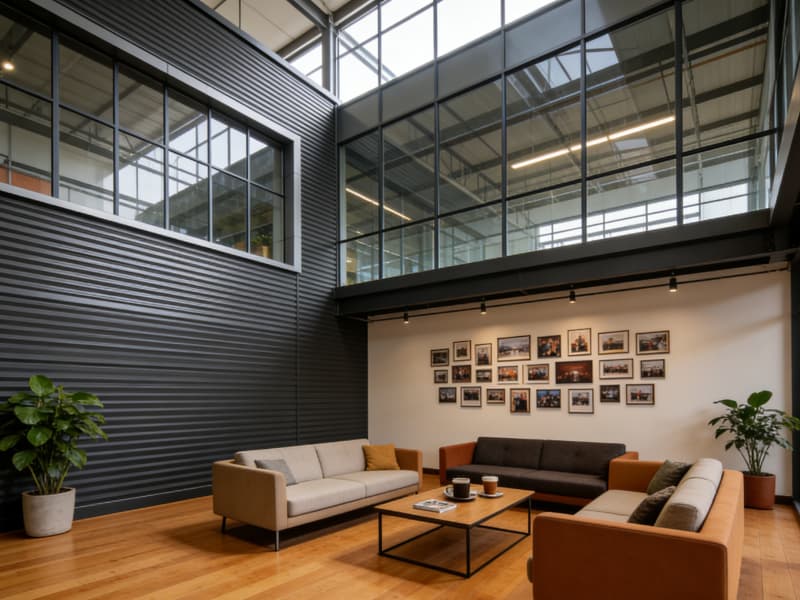進(jìn)入廠房內(nèi)部,生產(chǎn)區(qū)域挑高設(shè)計,空間開闊,頂部的桁架結(jié)構(gòu)裸露在外,搭配軌道式吊燈,營造出強烈的工業(yè)氛圍。地面選用耐磨的金剛砂地坪,承載能力強且便于清潔,滿足高強度生產(chǎn)需求。
