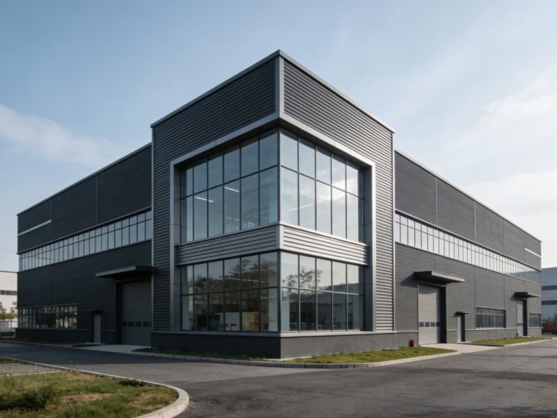 從外觀上看,廠房整體以深灰色為主色調(diào),搭配淺灰色的線條勾勒,呈現(xiàn)出沉穩(wěn)大氣的質(zhì)感。墻面采用金屬材質(zhì)與玻璃幕墻相間的設(shè)計,既保證了建筑的堅固性,又增強了采光與通透感,讓建筑在工業(yè)氛圍中不失現(xiàn)代氣息。