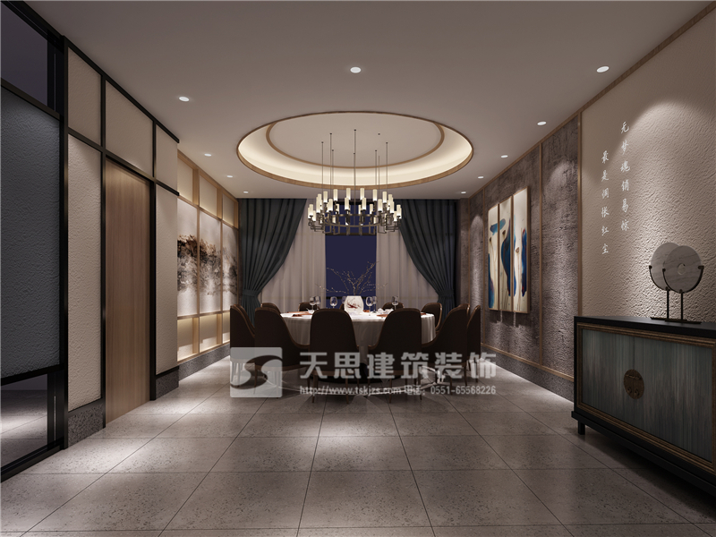 圓柱吊燈、墻壁刻字、墻壁上的國畫、餐具的擺放,一切的一切相互融合起來,形成一個優(yōu)質的就餐環(huán)境,在這里讓客戶感受到不一樣的就餐氛圍。