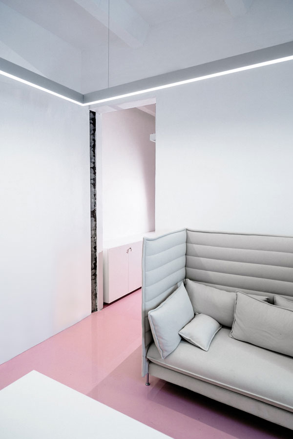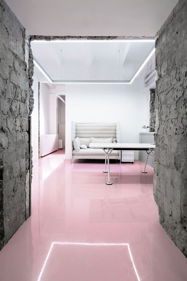 下面這個粉嫩嫩的辦公空間是NGRS獵頭公司位于莫斯科市中心的總部,鄰近紅場和克里姆林宮。該辦公室室內(nèi)設計采用了單一的白色色調(diào),并在地板上大面積的使用了柔和溫馨的粉色。該公司的職員90%是女性,這個萌發(fā)少女心的色彩方案以及半圓形臺階及拱門的設計得到了職員的一致好評。
