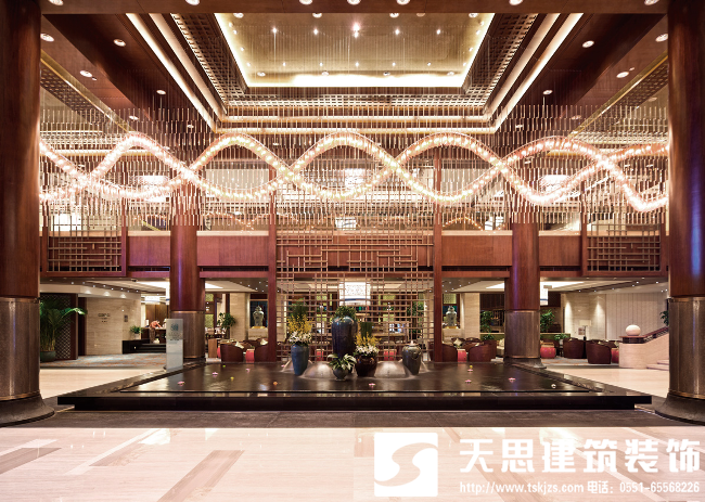 大堂的另一個(gè)風(fēng)格以抽象的格柵為裝飾,在中央景區(qū)的水景以寧?kù)o來突出水的主題,并以木格柵與水景組合成抽象的構(gòu)成。吊燈以水泡燈作為裝飾,有溫泉?dú)馀莸碾[喻,突出酒店設(shè)計(jì)的主題。