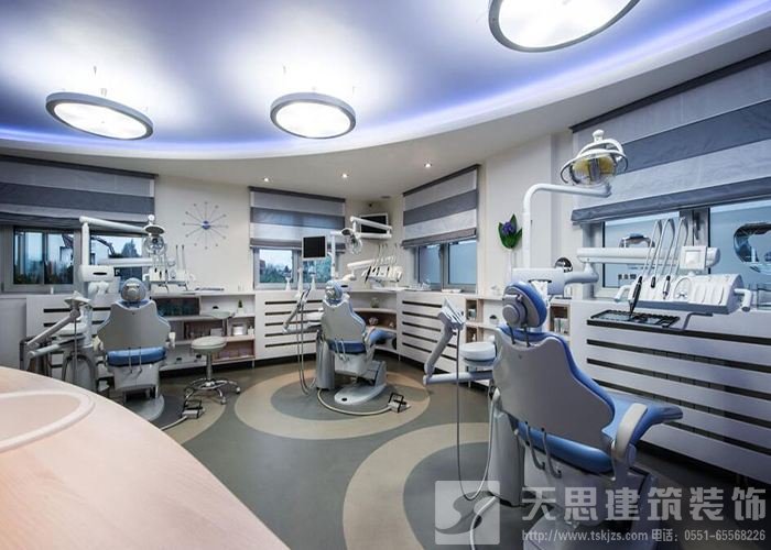 在口腔醫(yī)院設(shè)計(jì)方案中,建筑立面以白色冰火板和玻璃幕墻來(lái)營(yíng)造現(xiàn)代時(shí)尚感,體現(xiàn)醫(yī)療建筑的純粹及科技感,曲線的立面線條以藝術(shù)化的展現(xiàn)方式,合理地弱化醫(yī)療建筑的嚴(yán)謹(jǐn)、專業(yè),來(lái)減輕患者在即將進(jìn)入醫(yī)院內(nèi)部空間時(shí)產(chǎn)生的緊張情緒。進(jìn)入醫(yī)院大廳,以藍(lán)色營(yíng)造冷靜、專業(yè)、平和感,有藝術(shù)感的家具軟裝營(yíng)造休閑氛圍,清新明媚的色彩運(yùn)用帶來(lái)愉悅的視覺(jué)體驗(yàn),在強(qiáng)調(diào)醫(yī)療空間的專業(yè)特質(zhì)的同時(shí),打造出一個(gè)放松的、舒適的空間。