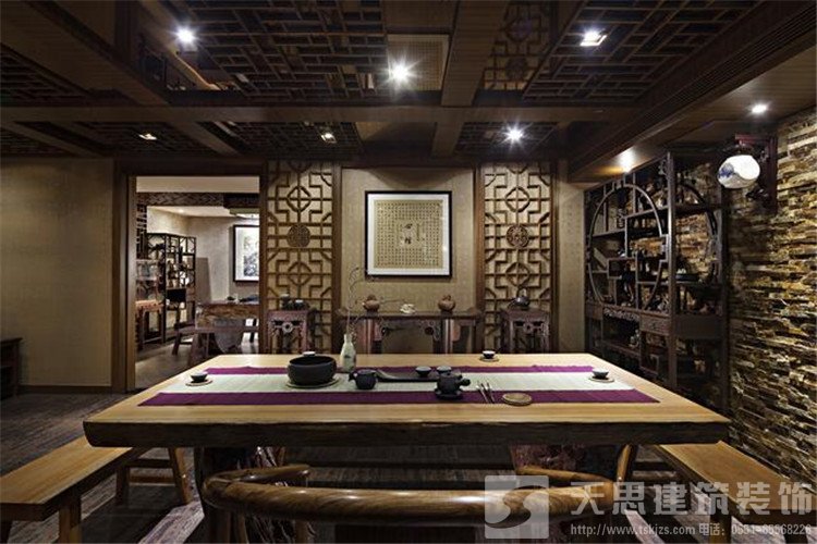 第一是傳統(tǒng)的地方風(fēng)格,這種風(fēng)格茶室多位于風(fēng)景旅游區(qū)、公園內(nèi),由于這種建筑本身就具有明顯的地方特色,因此茶室室內(nèi)設(shè)計大多也具有相同的風(fēng)格,因此多采用地方性較強(qiáng)的材質(zhì)進(jìn)行裝飾,如木、竹、藤以及石材等。頂棚可根據(jù)建筑本身的屋頂進(jìn)行設(shè)計,墻面盡可能打破單調(diào)感,可采用石材墻面或是木質(zhì)梁柱等來實(shí)現(xiàn),墻面可采用地方工藝品或是條軸字畫進(jìn)行裝飾,地面以青磚或是仿青磚材料鋪設(shè)為宜,也可以采用毛面花崗石。