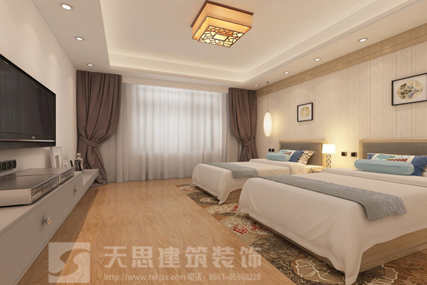 小型酒店客房,多以標(biāo)準(zhǔn)間、單人間為主,面積一般不會(huì)太大,不過(guò)可以利用延伸視覺(jué)效果的方法,來(lái)提升客房空間感。比如運(yùn)用由淺到深、富有層次感的彩色壁紙,搭配淡雅干凈的鋪蓋,安裝采光自然、光照充足的落地窗,延伸空間的同時(shí)也提高了舒適度。