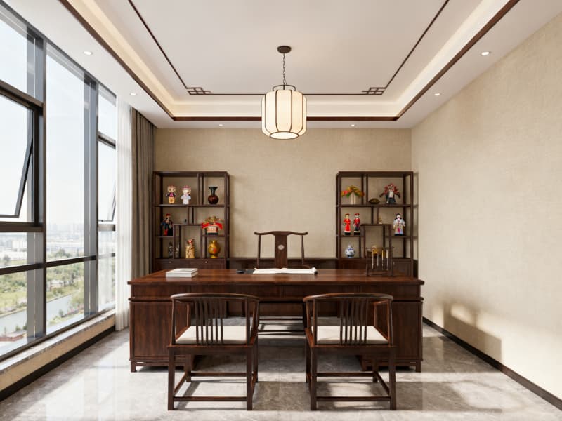 空間布局上,科學(xué)劃分開(kāi)放辦公區(qū)、獨(dú)立辦公室、會(huì)議室、休閑區(qū)等功能區(qū)域,優(yōu)化動(dòng)線設(shè)計(jì),保證辦公效率與使用舒適度。色彩以淺色系為基底,搭配深棕色實(shí)木元素,營(yíng)造雅致、沉穩(wěn)的視覺(jué)效果,同時(shí)通過(guò)落地玻璃窗、中式格柵吊燈等設(shè)計(jì)引入充足自然光線,減少空間壓抑感。