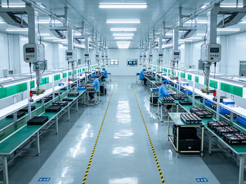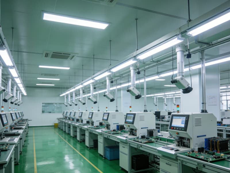 進入內(nèi)部,生產(chǎn)區(qū)布局緊湊且合理,采用智能化的懸掛式生產(chǎn)設備,搭配可調(diào)節(jié)的無影燈光源,確保生產(chǎn)操作的精準度。地面使用防靜電地坪,滿足電子設備生產(chǎn)需求。