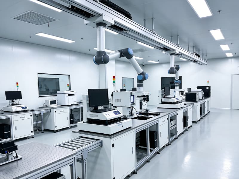 產(chǎn)品測試區(qū)以白色為主色調(diào),營造簡潔純凈的環(huán)境。各類先進的測試儀器有序擺放,頂部的軌道式機械臂可輔助完成復雜測試流程。