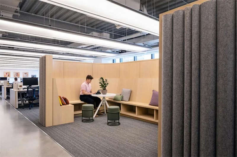 空間的聲學(xué)設(shè)計(jì)也經(jīng)過(guò)專業(yè)團(tuán)隊(duì)的仔細(xì)考量,以確保靈活的協(xié)作空間具有吸引力、舒適性和高效生產(chǎn)力。各種類型的會(huì)議空間從大型會(huì)議室到全面毛氈飾面的靜音“工作艙”;在辦公桌上方,采用了定制的聲學(xué)毛氈弧形擋板集成照明裝置,由此優(yōu)化開放工作區(qū)的聲學(xué)效果。