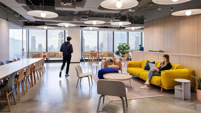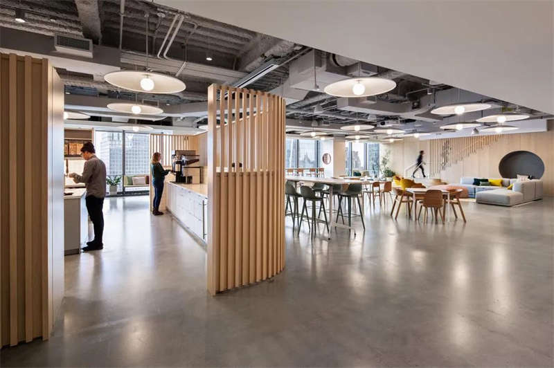 超大的開放式工作區(qū),其間穿插點(diǎn)綴著各式協(xié)作空間——從會(huì)議室到電話亭應(yīng)有盡有。兩個(gè)樓層都在建筑西側(cè)規(guī)劃了大而開敞的公共區(qū)域,這里享有廣闊的城市景觀視野和充足的日光,并通過(guò)一座木制樓梯上下緊密連接。