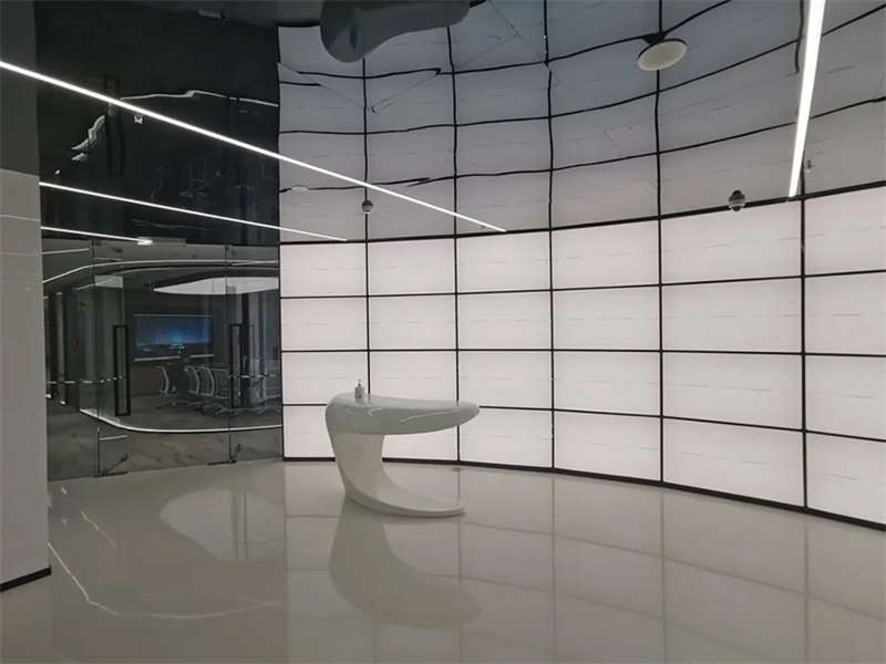 在電梯出來(lái),一步入半圓弧的接待前廳,馬上看到的是以安全氣囊元素為主創(chuàng)意的,帶燈光變化的半弧造型墻,時(shí)尚大氣。在這純粹的黑白灰空間里,一個(gè)純白色飛馳動(dòng)感造型的前臺(tái)安安靜靜的擺設(shè)在那,在不使用的時(shí)候,它也是一個(gè)時(shí)尚的藝術(shù)品。和背鏡墻相結(jié)合,體現(xiàn)了速度與安全的設(shè)計(jì)理念。