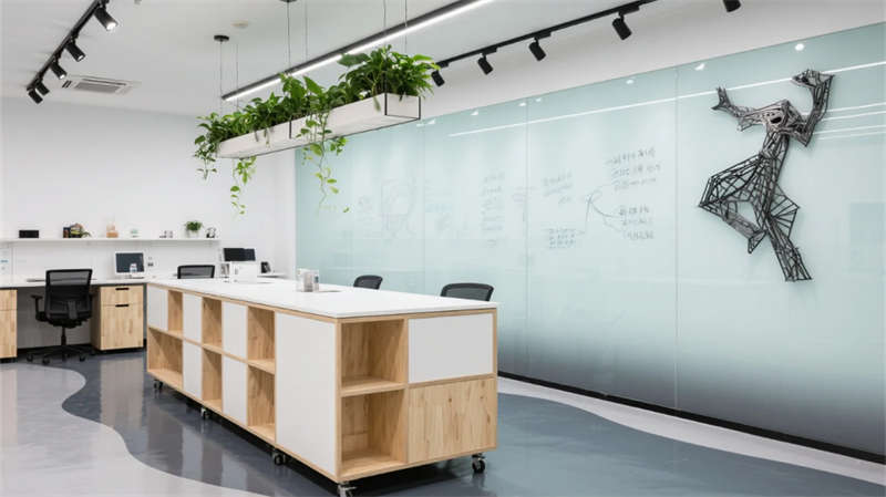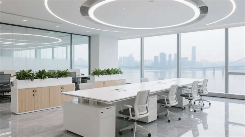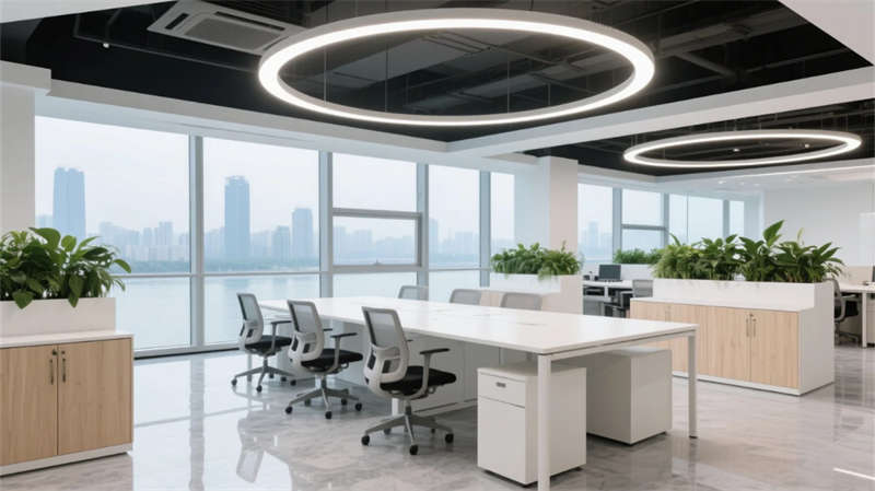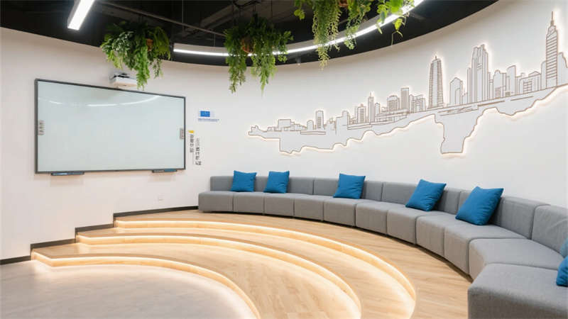 開放辦公區(qū)以模塊化綠植隔斷柔化邊界,智能會議艙曲面屏動態(tài)呈現(xiàn)江岸線,賦予協(xié)作以在地詩意。創(chuàng)意實驗室的可書寫玻璃墻與磁吸家具激發(fā)即興創(chuàng)造,而階梯沙龍區(qū)弧形燈帶如江水蜿蜒,引導(dǎo)思想交匯。