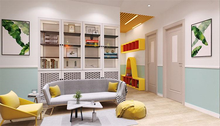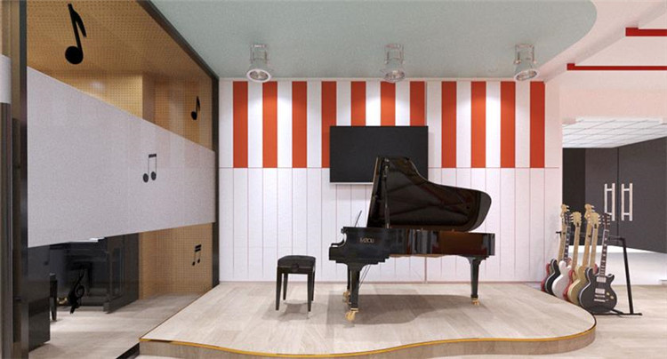 前廳不變的情況下,logo背景墻色調(diào)偏重,所以運(yùn)用了色彩降噪,添加了一些偏冷色調(diào),不僅能夠提升整個(gè)空間的舒適感,還能給孩子一個(gè)安全、放松的空間。結(jié)合了logo的主色調(diào),再進(jìn)行色彩搭配可以形成歡快、親切、活潑的色彩氛圍。與此同時(shí)還設(shè)置了也增加了兩間鋼琴室,提高了空間利用率。大廳玻璃教室內(nèi)墻面貼了吸音板,一方面體現(xiàn)機(jī)構(gòu)在音樂上的專業(yè)性,另一方面就是讓空間的隔音效果做到最佳,讓孩子在學(xué)習(xí)的時(shí)候不受干擾,能夠安靜的學(xué)習(xí)。