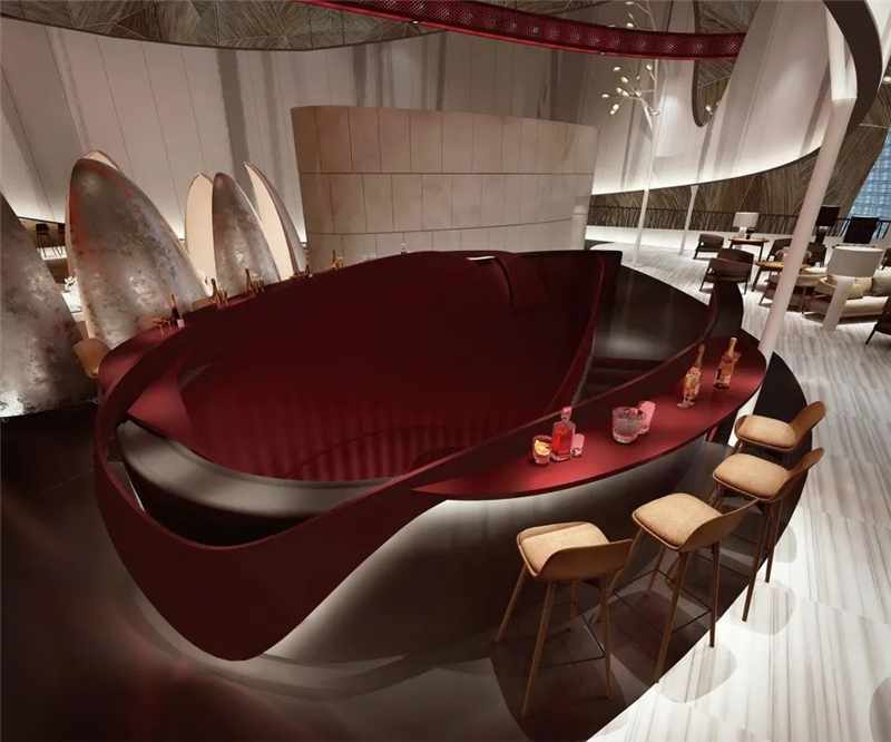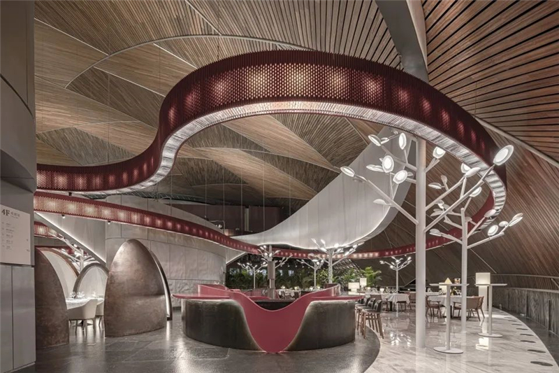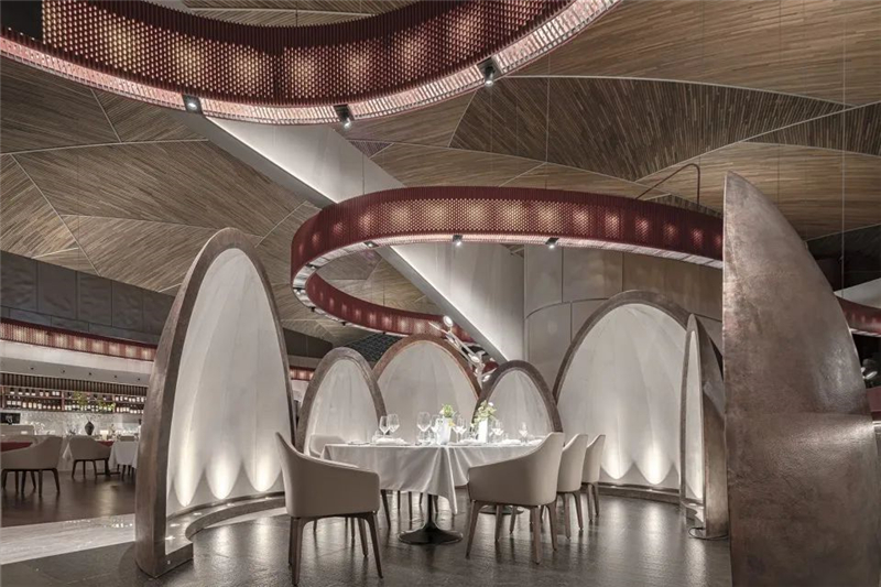 ?、苎鐣?huì)廳的地面經(jīng)常鋪設(shè)暖色調(diào)的地毯,墻面裝飾通常使用吸音性能較好的壁紙、織物軟包,吊頂應(yīng)結(jié)合建筑結(jié)構(gòu)、梁柱的位置與大小來進(jìn)行餐廳設(shè)計(jì)。