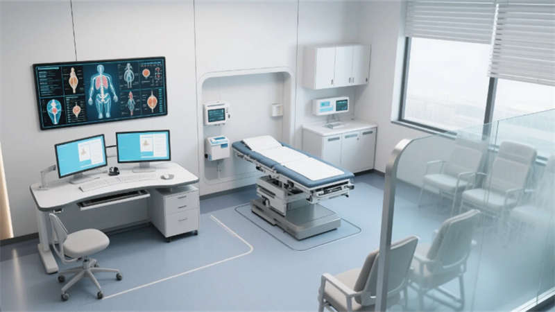 空間以低飽和度灰綠為基調,原生木紋肌理與仿生曲面造型貫穿各區(qū)域,形成視覺連續(xù)性。主入口大廳通過挑空木格柵天花引入模擬天光,曲面導診臺整合智能導航系統(tǒng),落地窗外的療愈庭院模糊室內外界限。診室采用霧化玻璃隔斷保障私密性,模塊化醫(yī)療設備帶與升降診療桌形成靈活工作界面,電子解剖圖譜墻實現(xiàn)醫(yī)患可視化溝通。