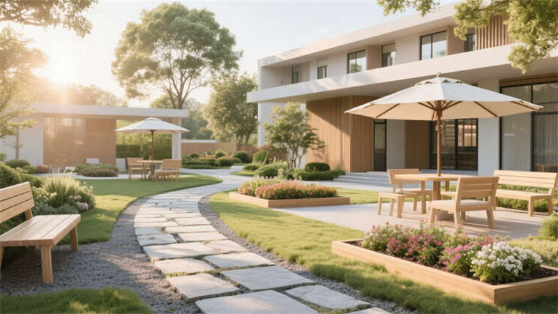 這套老年康養(yǎng)中心設(shè)計以現(xiàn)代簡約風格為核心,營造一個溫馨、安全且充滿活力的生活空間。設(shè)計強調(diào)自然光與柔和色彩的融合,入口大廳以開闊布局和藝術(shù)元素傳遞家的溫暖,休息區(qū)則通過舒適沙發(fā)和綠植打造社交港灣。餐廳和活動室注重功能性,淺色調(diào)家具與靈活布局鼓勵日?;樱龠M社區(qū)歸屬感。居住單元采用圓角細節(jié)和私密氛圍,確保舒適休憩??祻陀柧殔^(qū)融入防滑設(shè)計和自然光,支持健康活動。戶外庭院成為心靈綠洲,石板步道與花壇提供寧靜放松。多功能廳則適應(yīng)多樣需求,增強空間活力。整體設(shè)計以適老化理念貫穿,避免繁雜裝飾,突出簡約美學與人性關(guān)懷,讓每位長者感受到尊重與陪伴,在簡約中體驗生活的美好。