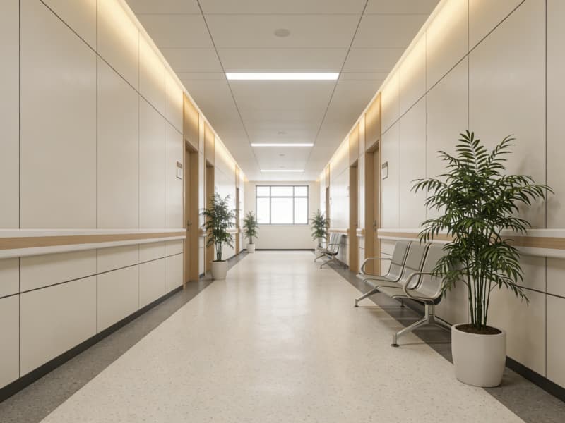 門診大廳以淺木色與純凈白為基調(diào),挑高空間搭配懸浮式吊頂,自然光透過(guò)大面積落地窗灑入,與室內(nèi)精心布置的景觀綠植呼應(yīng),消解患者的緊張感。分診臺(tái)采用弧形設(shè)計(jì),圓角處理的臺(tái)面與溫潤(rùn)的材質(zhì)傳遞出細(xì)膩關(guān)懷。